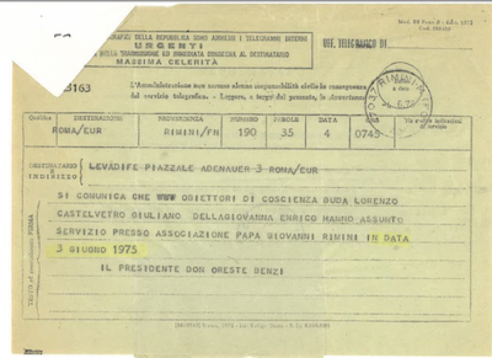 Il telegramma con cui il 3 giugno 1975 don Oreste Benzi comunicava al Levadife l'inizio del servizio civile per i primi tre obiettori di coscienza.