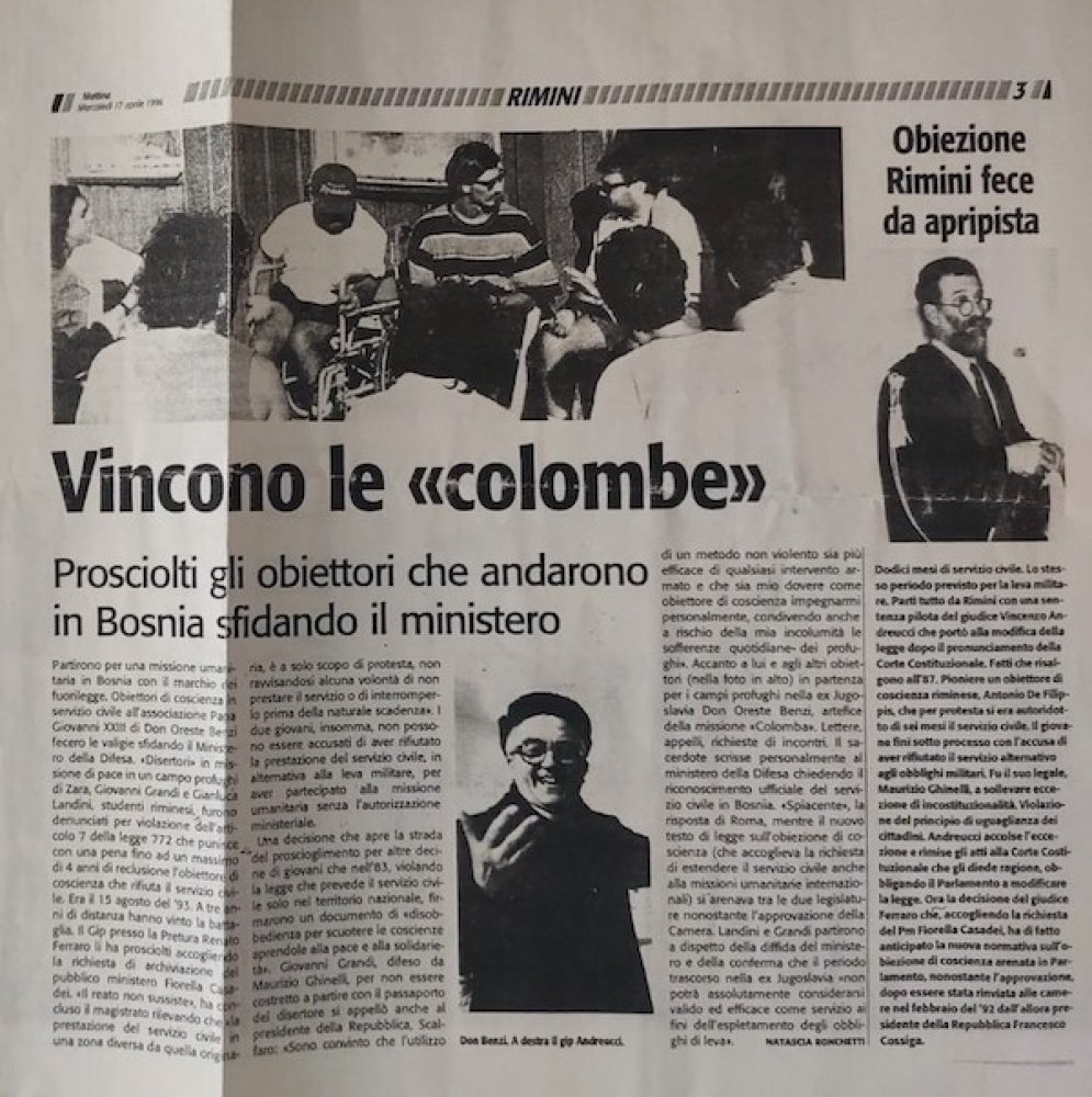 Un articolo di cronaca del 1996 ricostruisce la vicenda di due obiettori di coscienza partiti per una missione umanitaria all'estero, una scelta all'epoca non consentita, per cui vennero accusati di diserzione ma poi prosciolti.