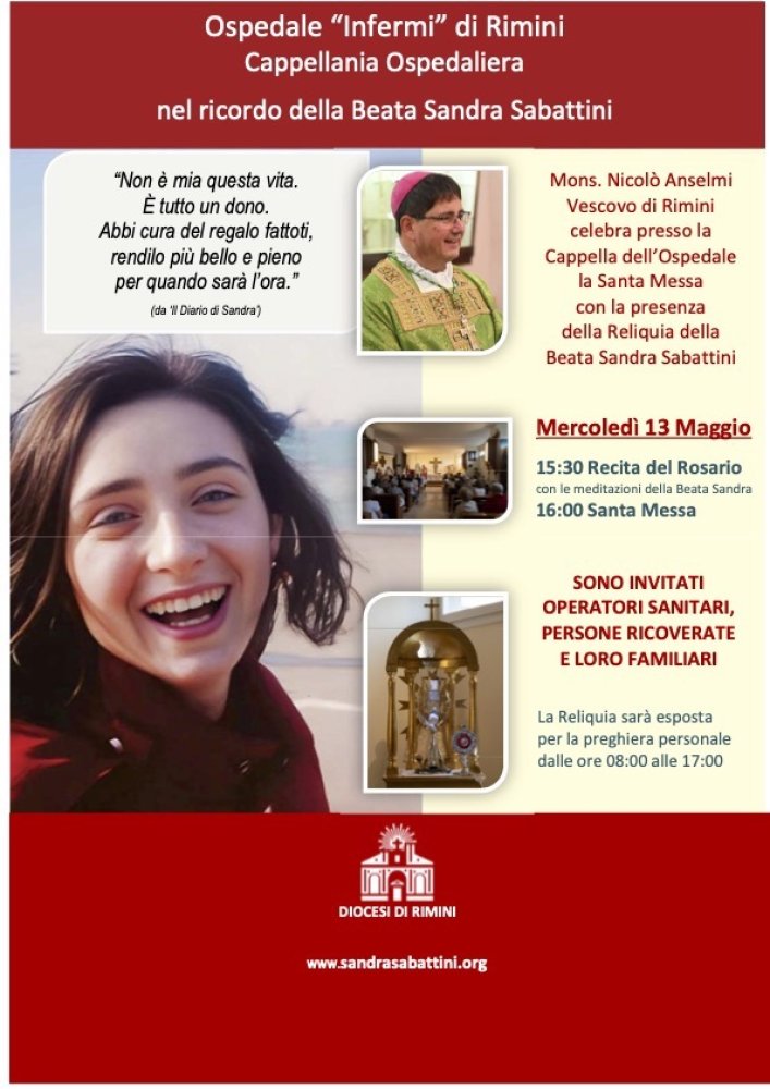Le celebrazioni si concluderanno con un momento di profonda sensibilità mercoledì 13 maggio presso l’Ospedale "Infermi" di Rimini. Sandra, che desiderava diventare medico missionario, raggiunge idealmente le corsie. Dalle ore 08:00 alle 17:00 presso la Cappella dell'Ospedale sarà esposta la Reliquia della Beata per la preghiera personale. Alle 15:30 la Recita del Rosario sarà accompagnata dalle meditazioni di Sandra. Alle ore 16:00 la Santa Messa verrà celebrata dal vescovo Nicolò Anselmi Sono invitati gli operatori sanitari, le persone ricoverate e i loro familiari.